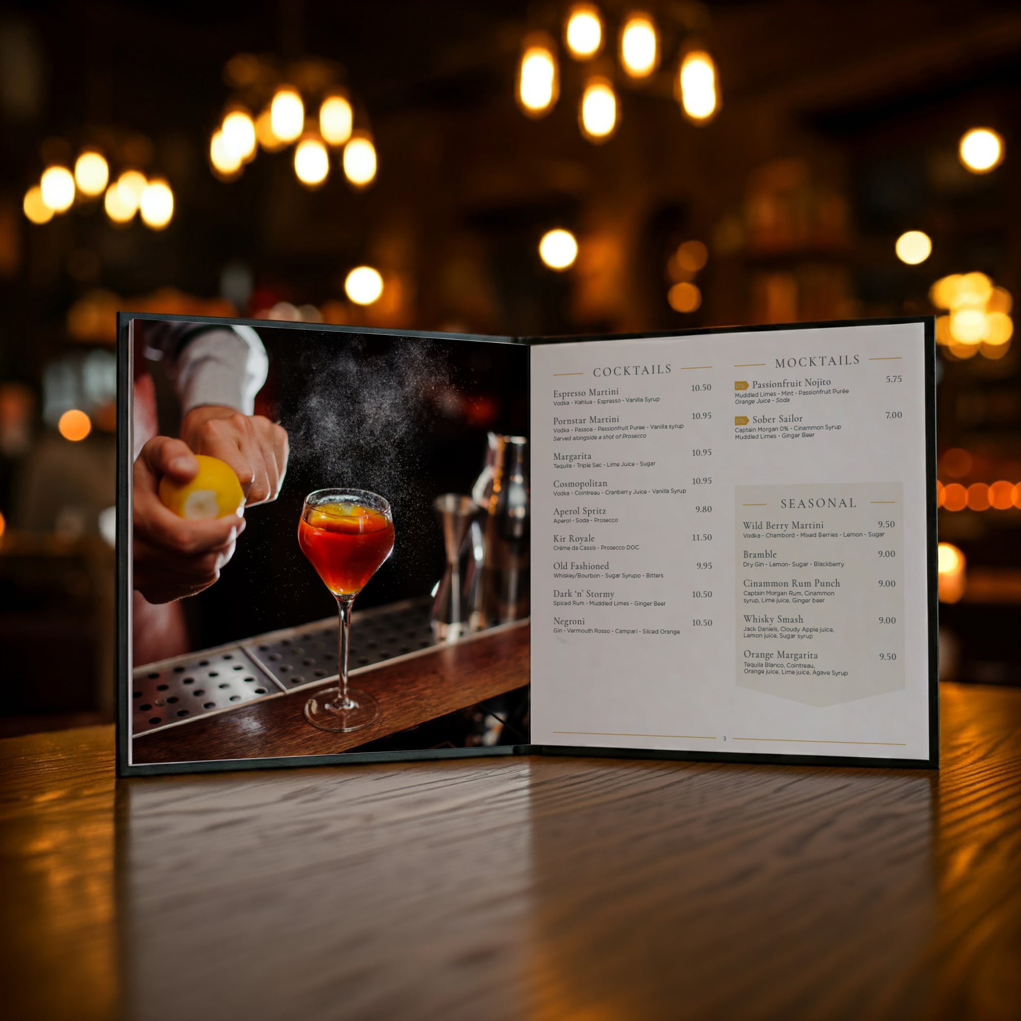 - Created a full suite of menus: Main, Drinks, Dessert, Lunch, Sunday, and Kids menus.